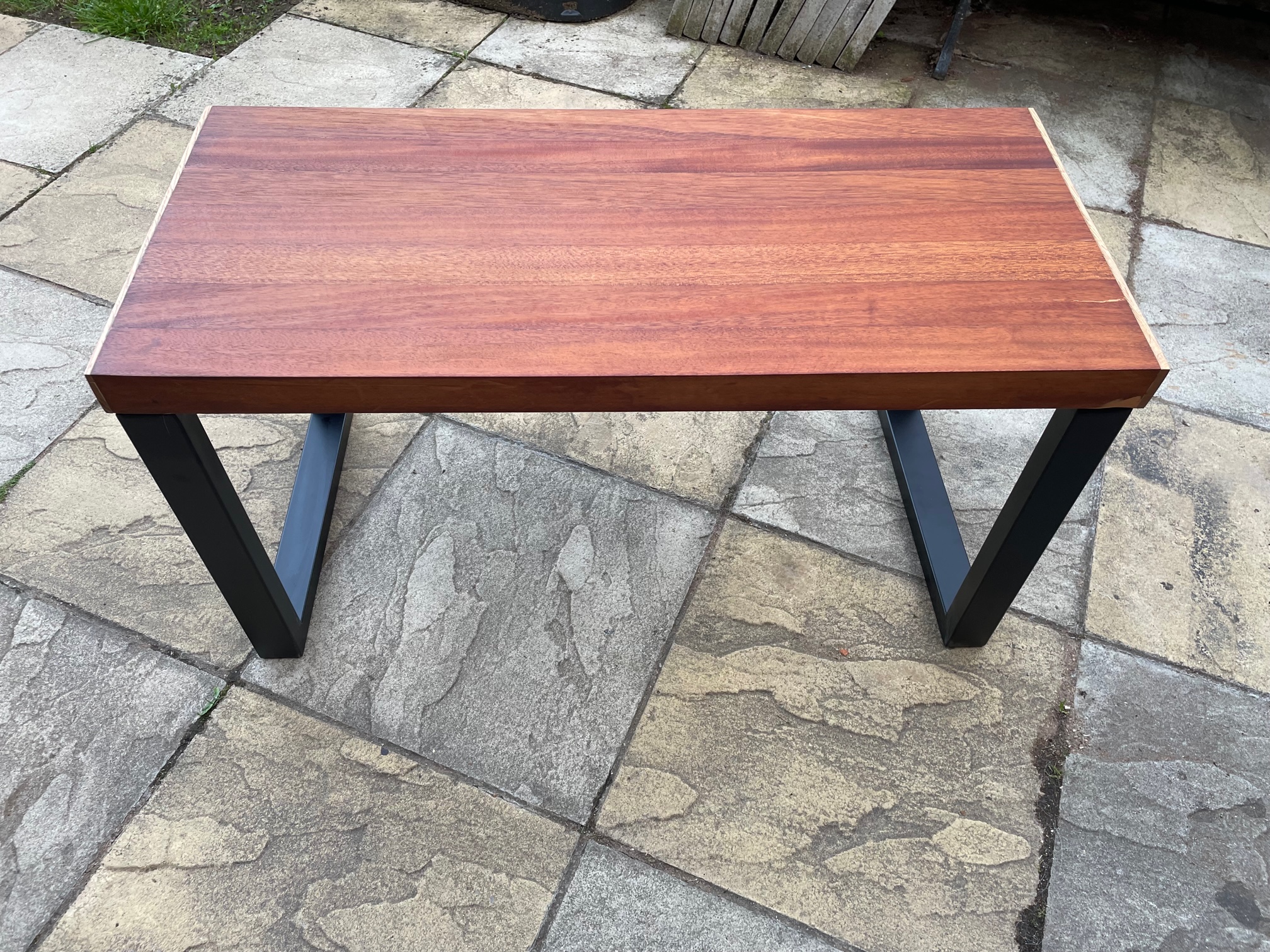 Entirely handmade from salvaged 1960s Utile (Sipo Mahogany) table legs and crafted together into an industrial style coffee table. English Oak moulding and steel, square supports. Very chunky, thick 50mm table top. Stunning wax finish. Unique, one-of-a-kind piece.